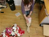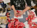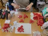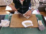 型紙と布地の間み綿を入れ、布地で包むようにして糊を付け、各パーツを製作します。