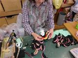 手描きの面相にスガ糸を張った髪形のパーツ・櫛やかんざしなどを糊付けし組みあげます。