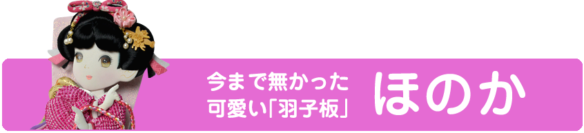 匠一好のオリジナル商品「ほのか」 羽子板における面相は、これまで統一された大人顔でした。 もらうお子様が愛着をもって羽子板に触れてほしい。そういった気持から、面相を可愛い表情にディフォルメし、より身近な存在としていただきたく生まれたのが「ほのか」です。 お気軽にお問い合わせください お問い合わせはこちら 商品のご案内Product Information